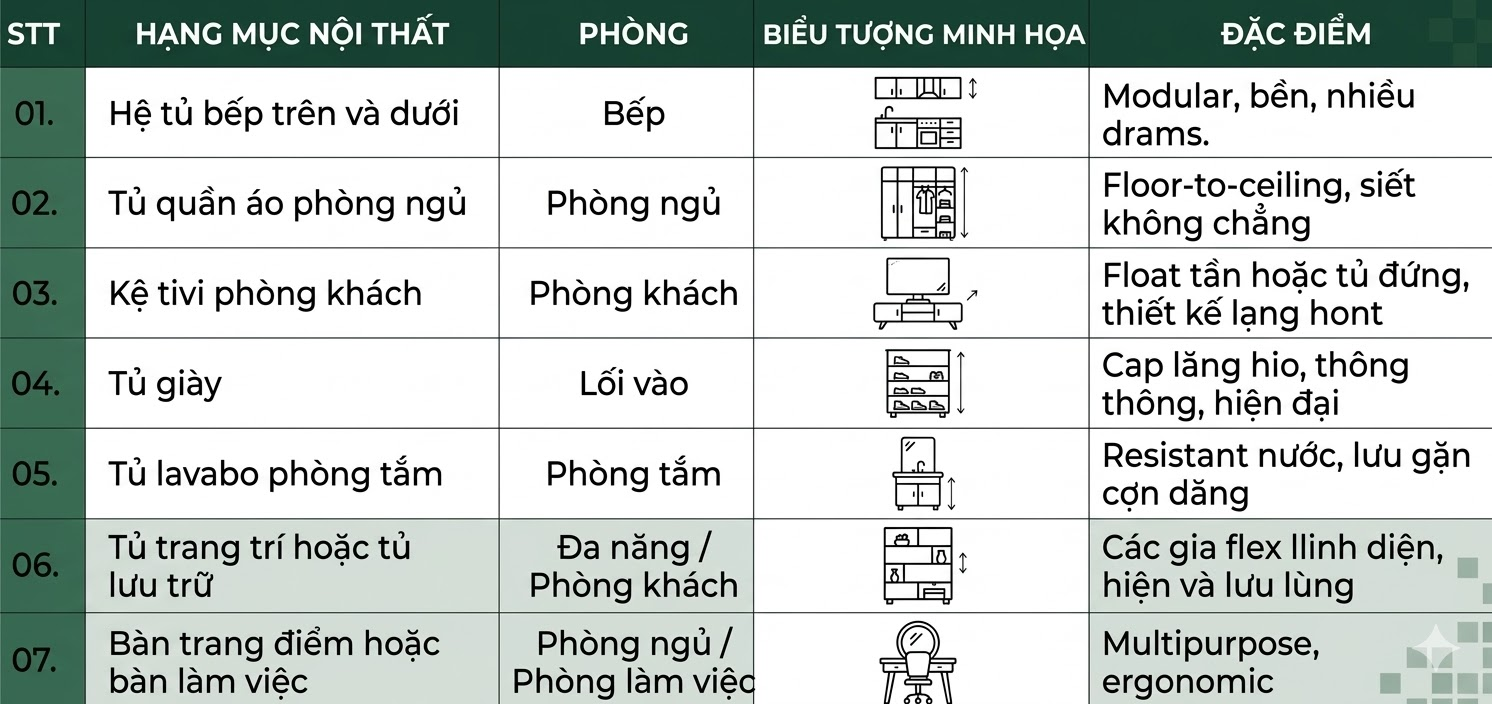 Các hạng mục nội thất thường có trong gói tiêu chuẩn gồm:
