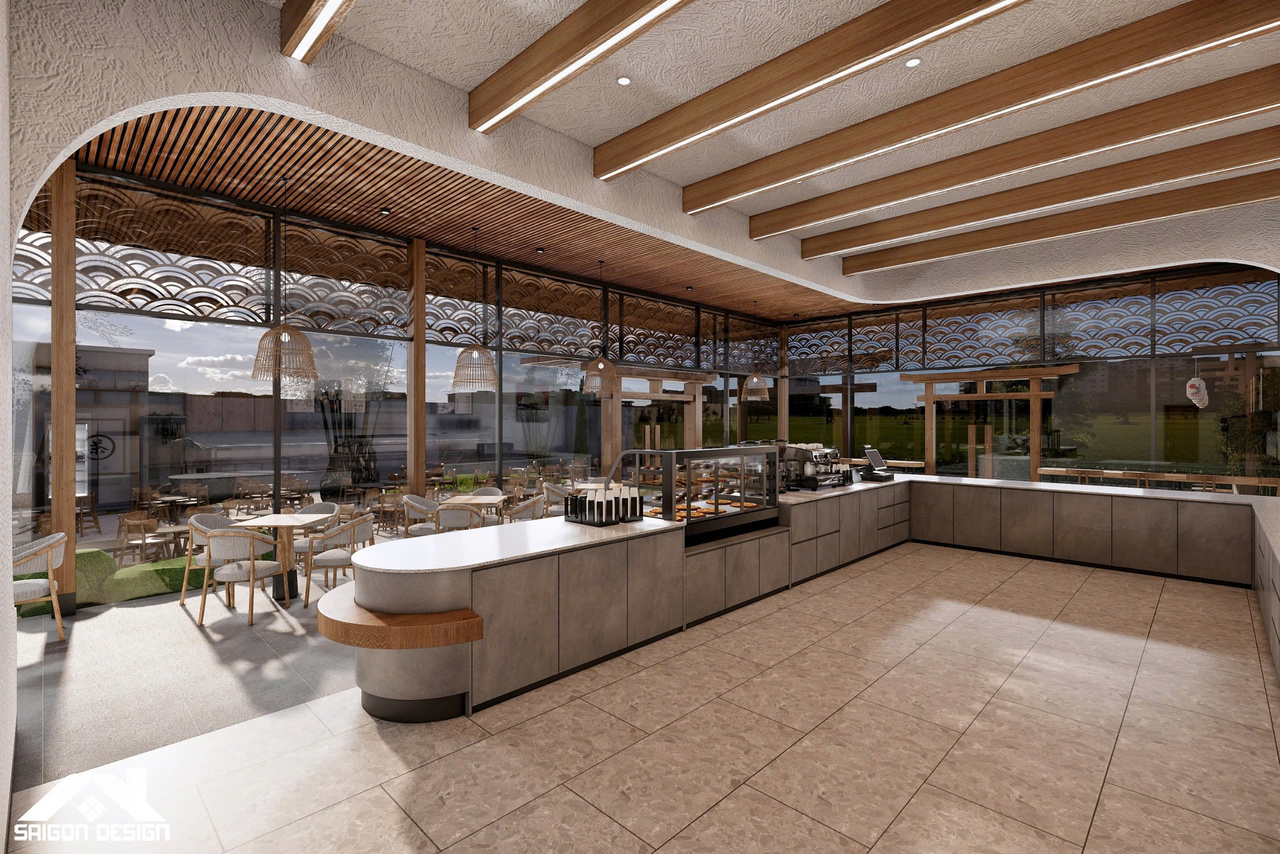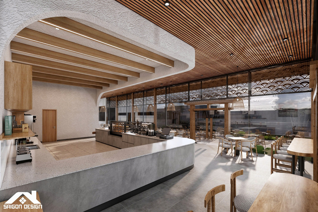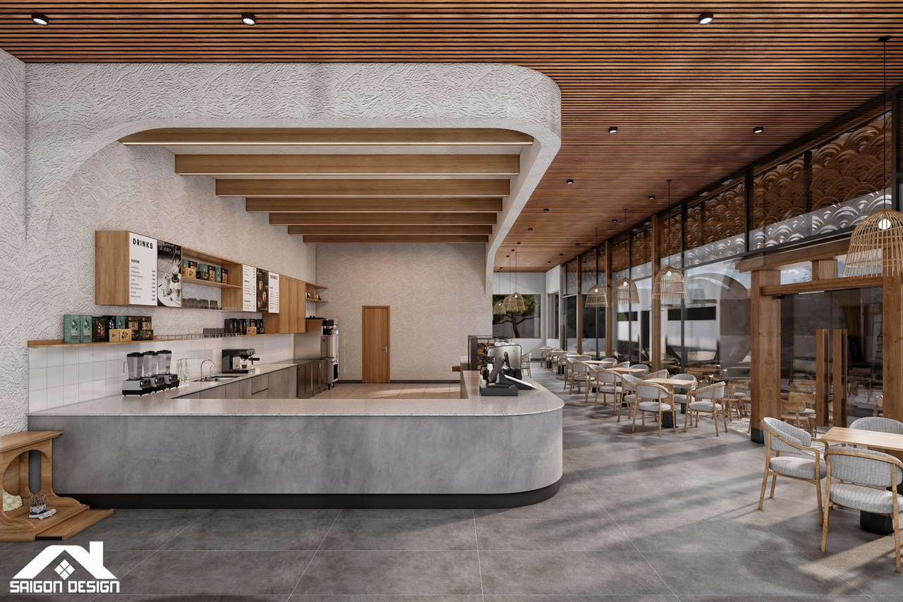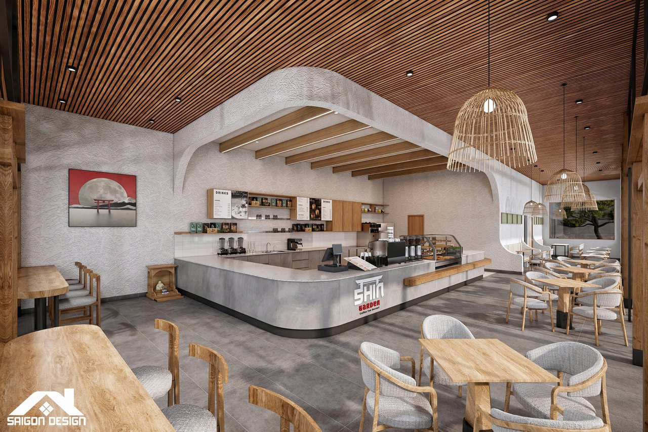 Tọa lạc trên cung đường Đinh Tiên Hoàng, SHIN GARDEN không chỉ là một quán cà phê mà còn là một tác phẩm nghệ thuật kiến trúc đầy cảm hứng, nơi phong cách Hiện đại giao thoa cùng tinh thần Nhật Bản (Japandi) và triết lý Wabi-sabi. Với quy mô 1 trệt 3 lầu, đội ngũ kiến trúc sư đã khéo léo biến những vật liệu thô mộc như bê tông mài, vữa thô và gỗ tự nhiên thành một không gian có chiều sâu, tôn vinh vẻ đẹp của sự giản đơn và tinh tế. Điểm nhấn ấn tượng nhất chính là sự kết hợp giữa những đường cong bo góc mềm mại của hệ quầy bar và trần cấp, giúp xóa tan sự cứng nhắc thường thấy trong cấu trúc nhà phố hiện đại.