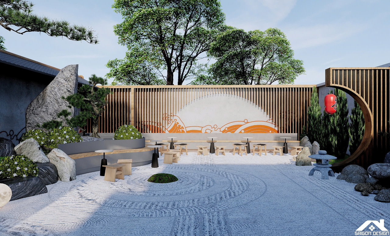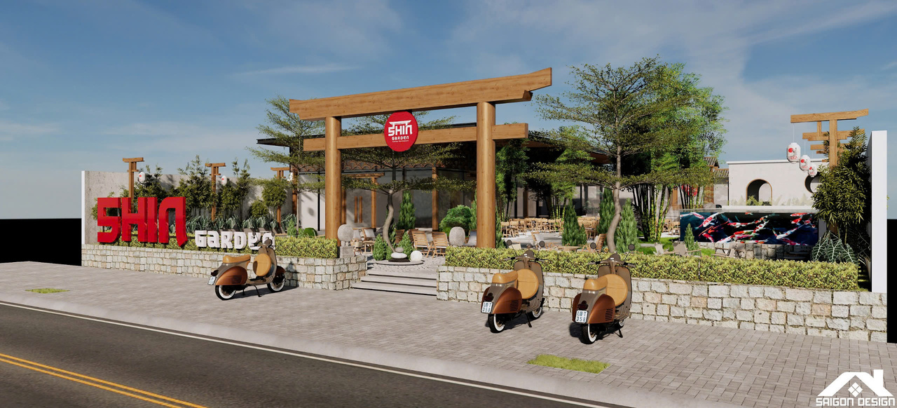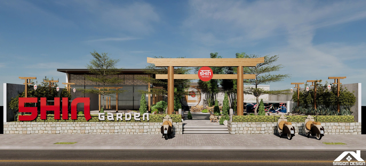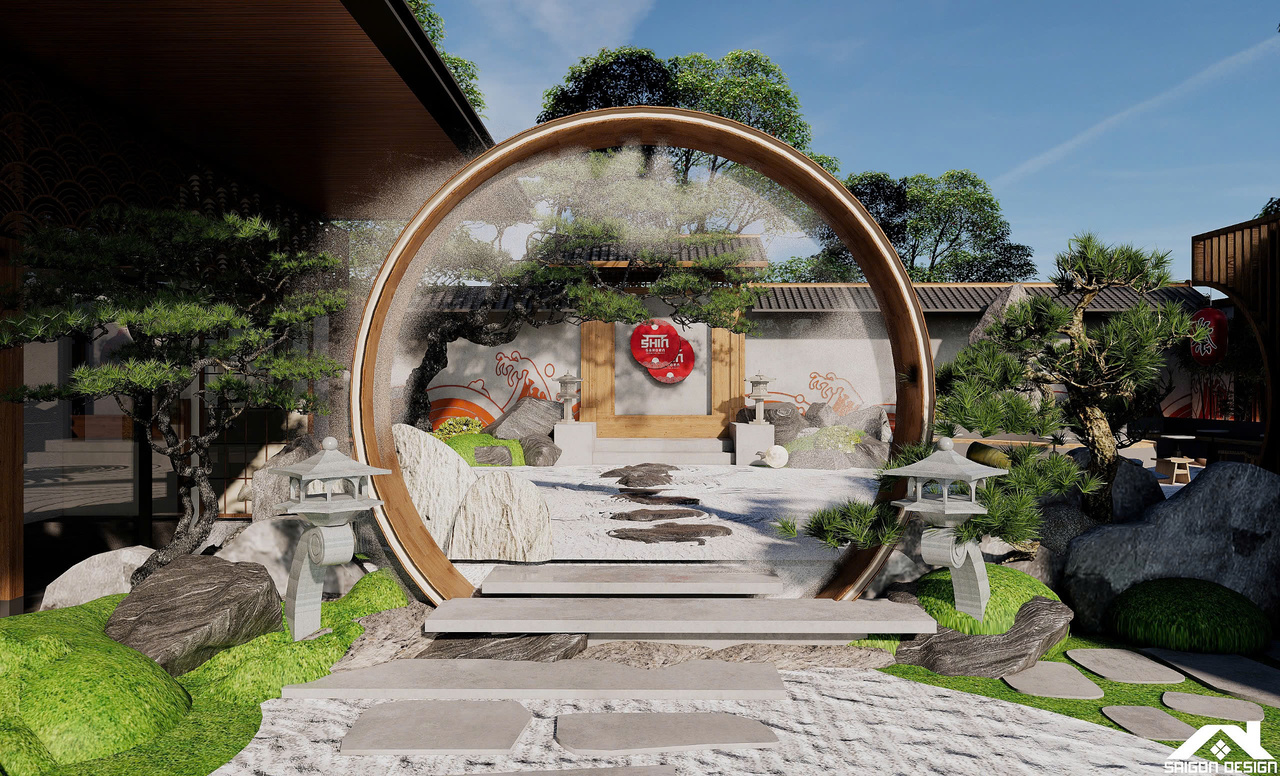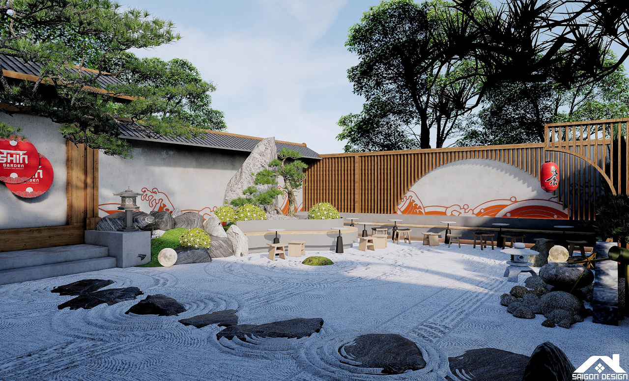 Linh hồn của SHIN GARDEN nằm ở khu vườn Zen (Karesansui) cát trắng cào sóng và đá cuội với hồ cá Koi lớn, tạo nên một khoảng lặng thị giác đầy tính thiền định. Việc lồng ghép khéo léo các yếu tố bản sắc như đèn lồng tre, hệ lam gỗ và họa tiết sóng biển Seigaiha mang lại cảm giác thân thuộc nhưng vẫn đậm chất thời thượng. Trong bảng màu trung tính của trắng kem và xám bê tông, SHIN GARDEN hiện ra như một ốc đảo bình yên, nơi khách hàng có thể tách biệt hoàn toàn với sự ồn ào bên ngoài để tận hưởng sự thư thái tuyệt đối trong từng giác quan.