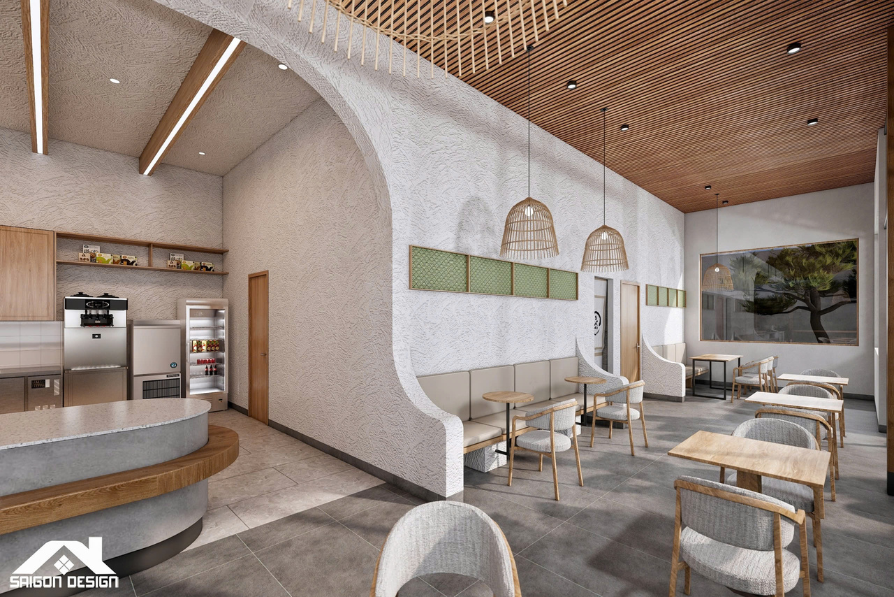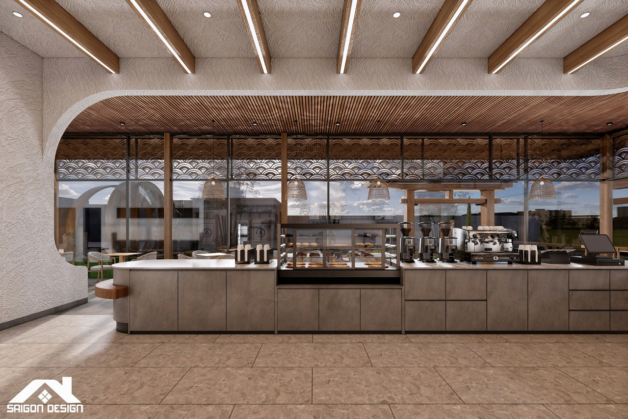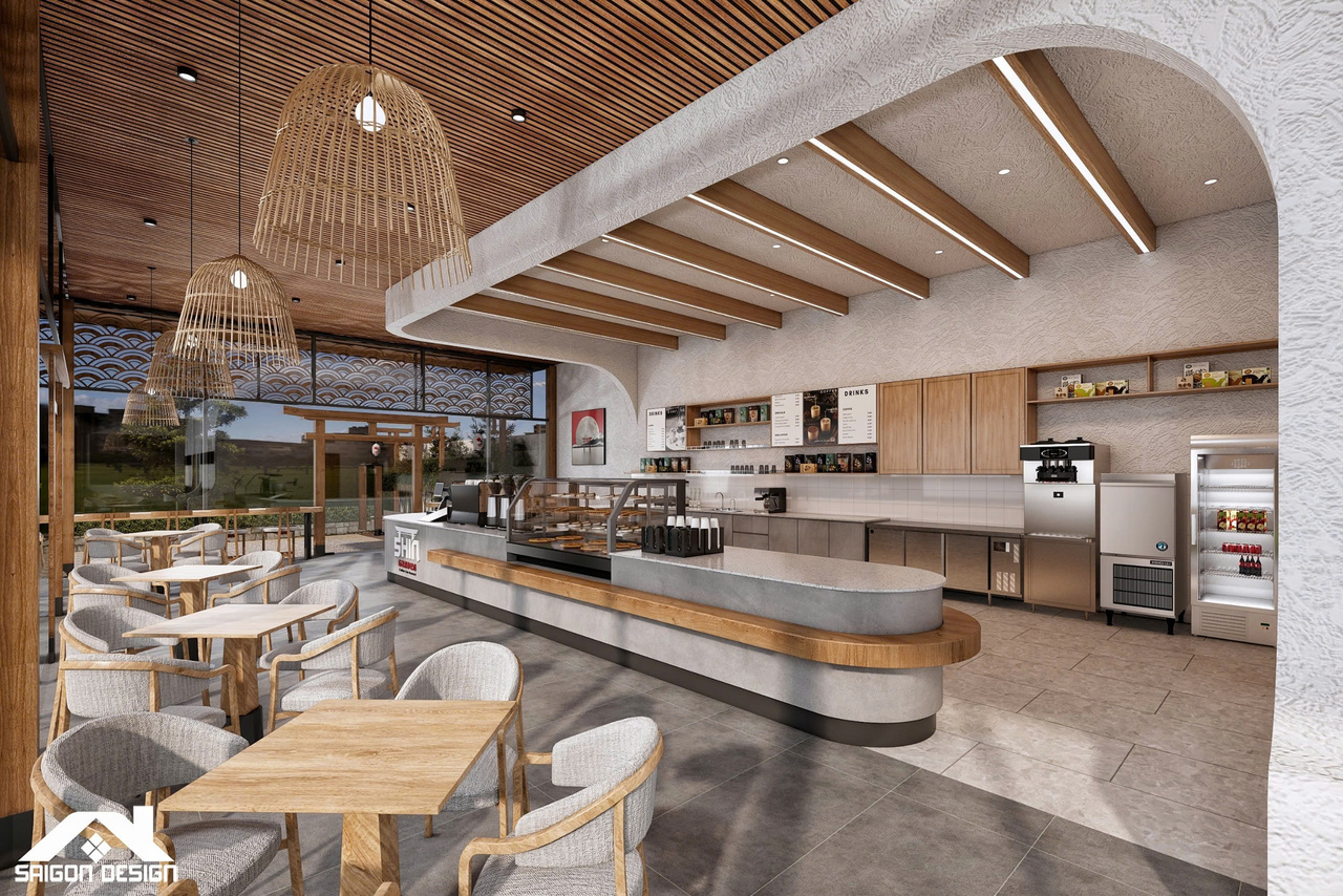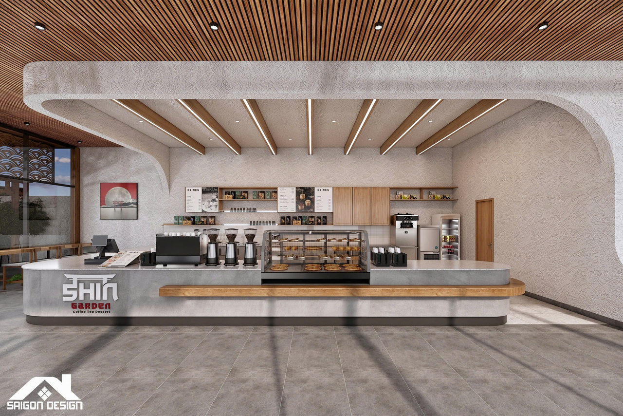 Tọa lạc trên cung đường Đinh Tiên Hoàng, SHIN GARDEN không chỉ là một quán cà phê mà còn là một tác phẩm nghệ thuật kiến trúc đầy cảm hứng, nơi phong cách Hiện đại giao thoa cùng tinh thần Nhật Bản (Japandi) và triết lý Wabi-sabi. Với quy mô 1 trệt 3 lầu, đội ngũ kiến trúc sư đã khéo léo biến những vật liệu thô mộc như bê tông mài, vữa thô và gỗ tự nhiên thành một không gian có chiều sâu, tôn vinh vẻ đẹp của sự giản đơn và tinh tế. Điểm nhấn ấn tượng nhất chính là sự kết hợp giữa những đường cong bo góc mềm mại của hệ quầy bar và trần cấp, giúp xóa tan sự cứng nhắc thường thấy trong cấu trúc nhà phố hiện đại.