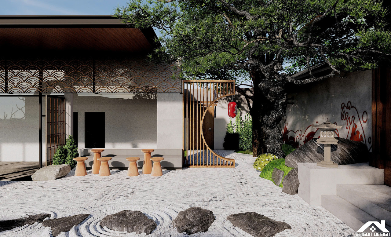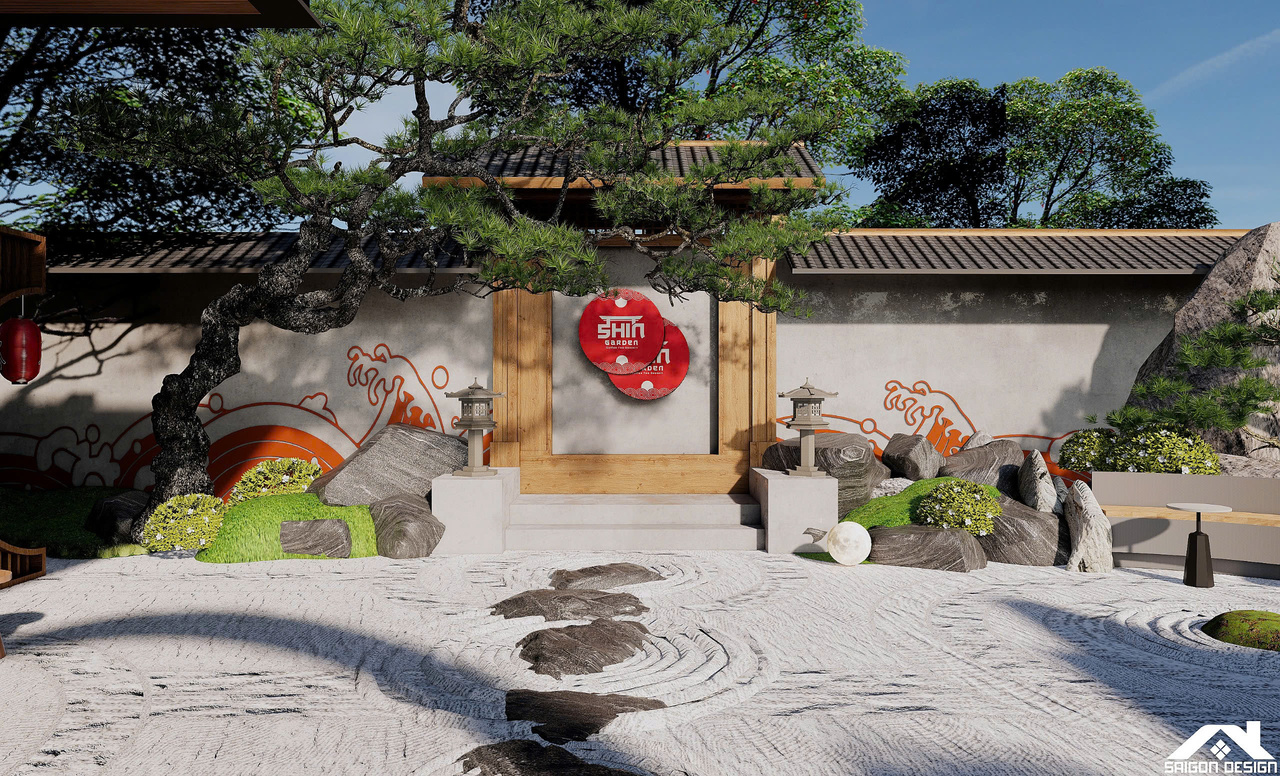 Linh hồn của SHIN GARDEN nằm ở khu vườn Zen (Karesansui) cát trắng cào sóng và đá cuội với hồ cá Koi lớn, tạo nên một khoảng lặng thị giác đầy tính thiền định. Việc lồng ghép khéo léo các yếu tố bản sắc như đèn lồng tre, hệ lam gỗ và họa tiết sóng biển Seigaiha mang lại cảm giác thân thuộc nhưng vẫn đậm chất thời thượng. Trong bảng màu trung tính của trắng kem và xám bê tông, SHIN GARDEN hiện ra như một ốc đảo bình yên, nơi khách hàng có thể tách biệt hoàn toàn với sự ồn ào bên ngoài để tận hưởng sự thư thái tuyệt đối trong từng giác quan.