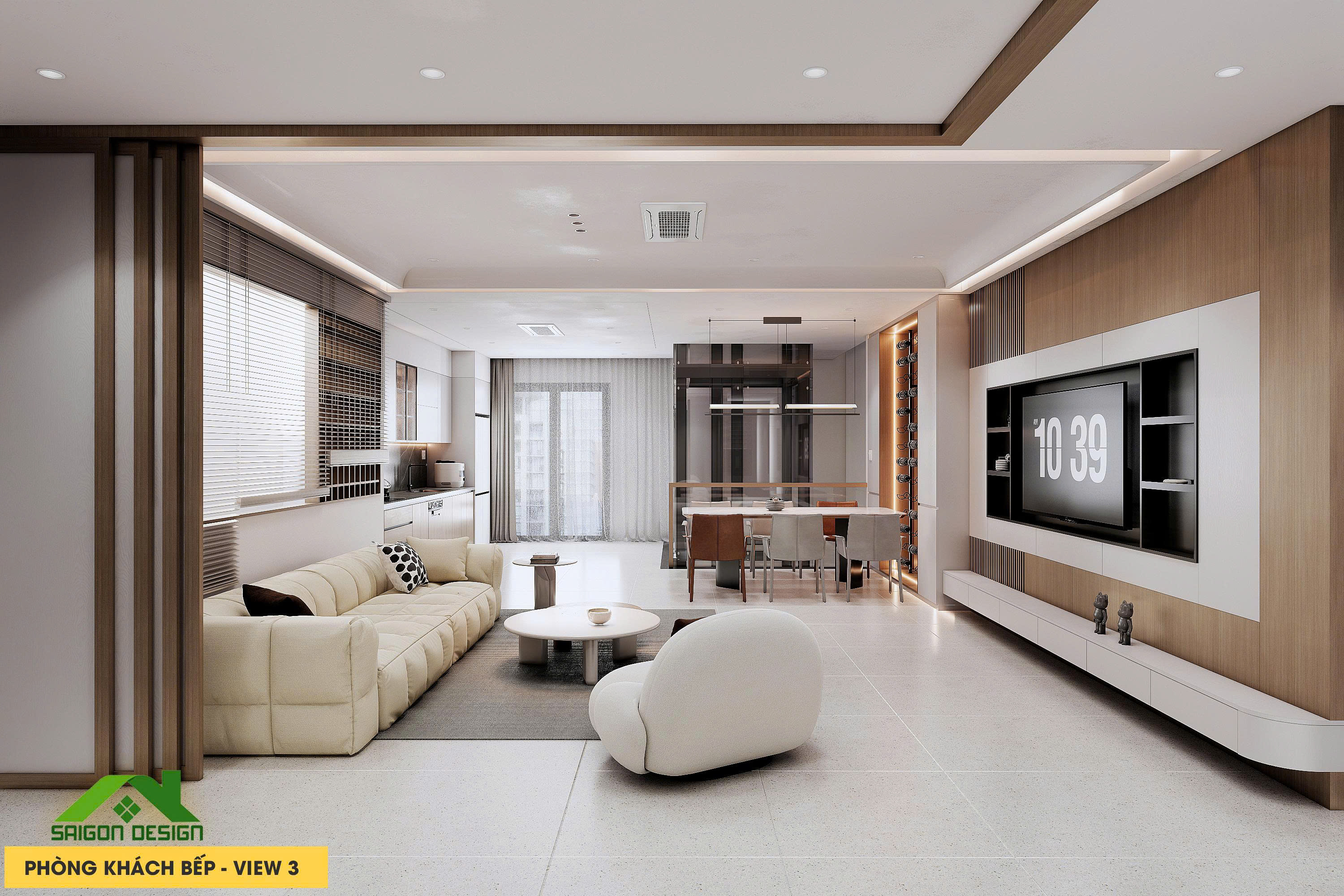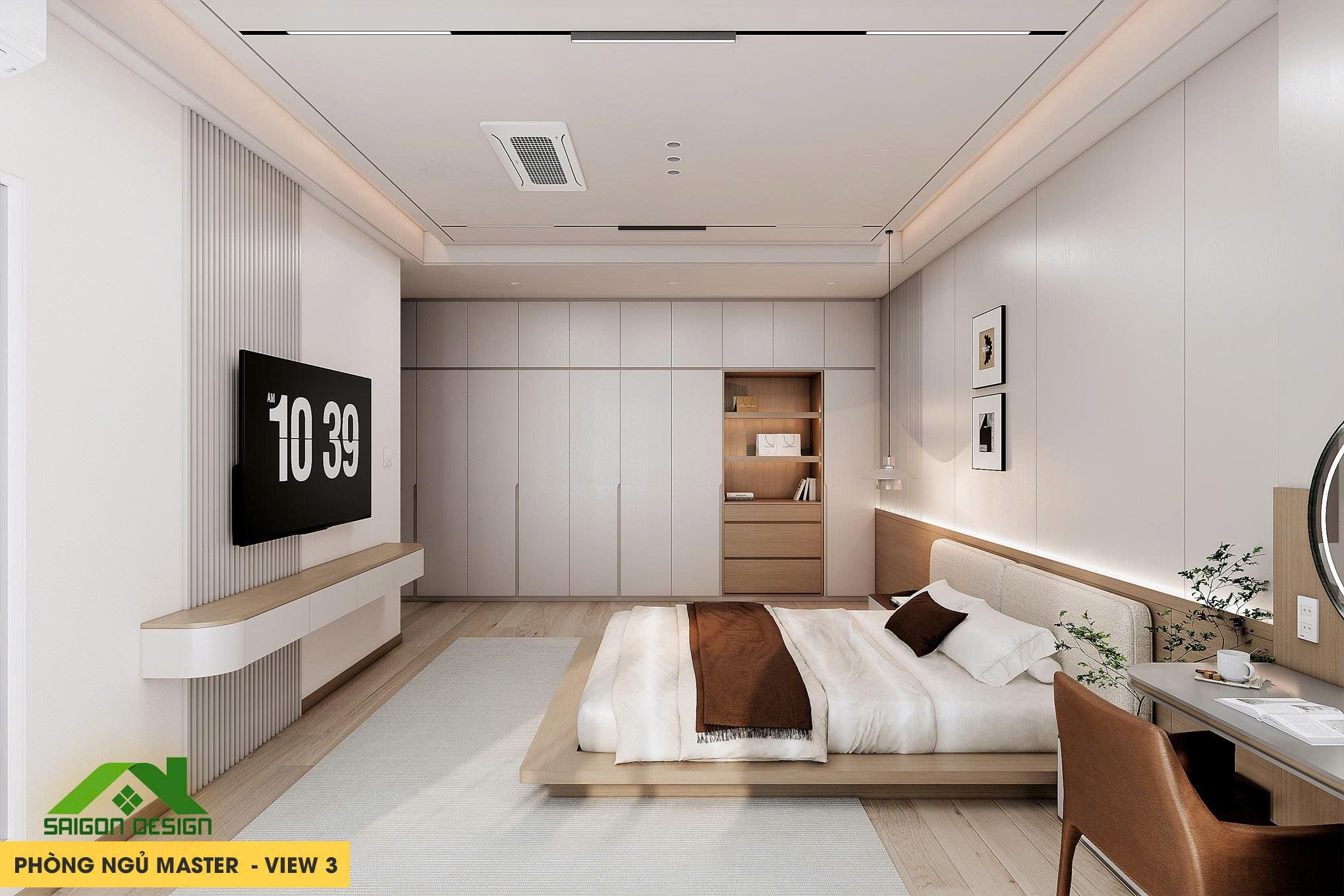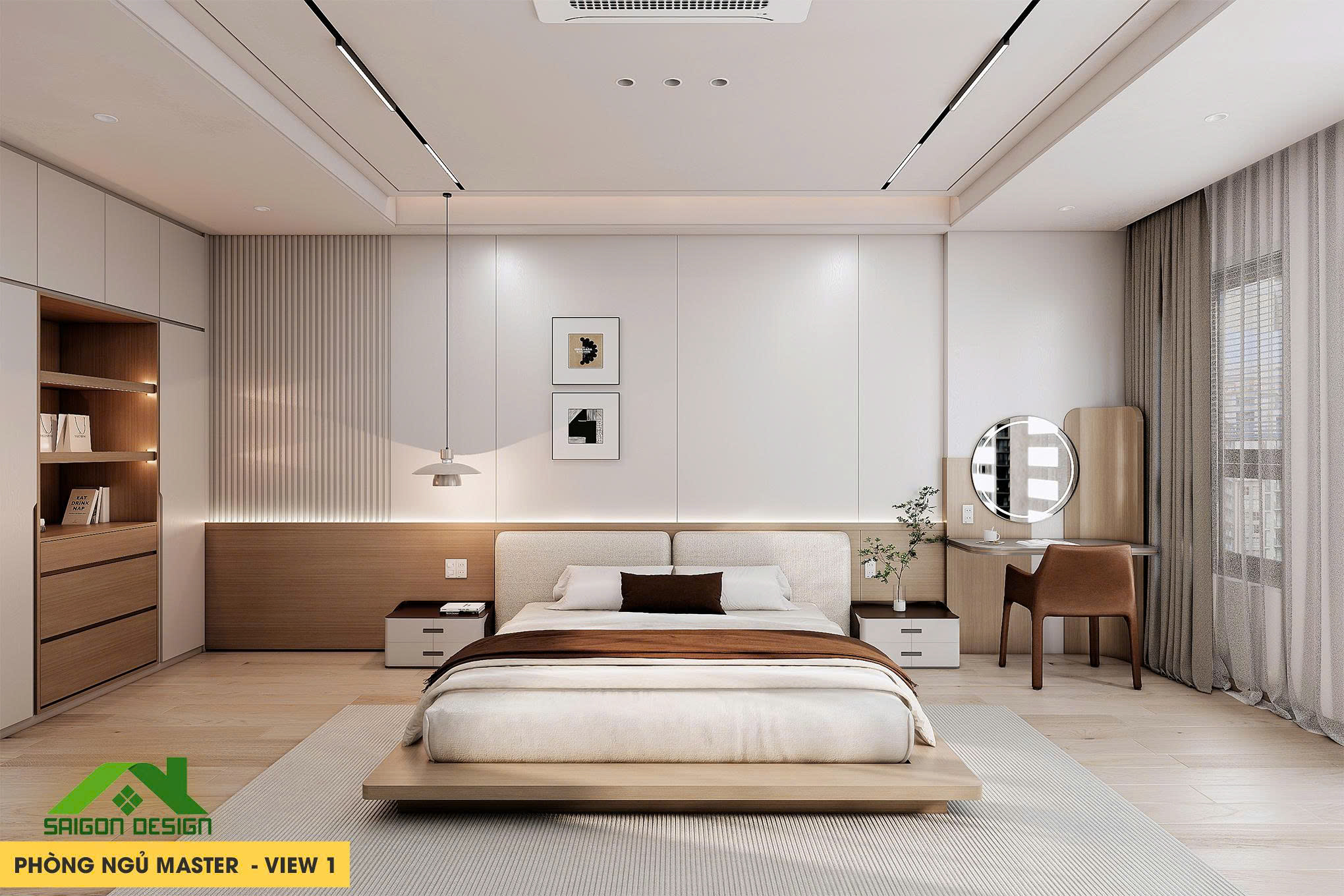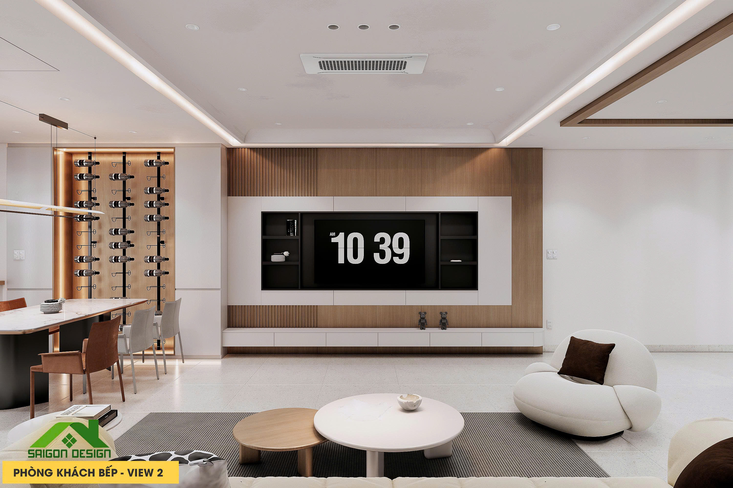 Dự án trung thành với phong cách Hiện đại, sử dụng bảng màu chủ đạo gồm Trắng và Gỗ. Sự kết hợp giữa sắc trắng tinh khôi và tông gỗ ấm áp tạo nên một tổng thể trang nhã, giúp không gian như rộng mở và nhẹ nhàng hơn.