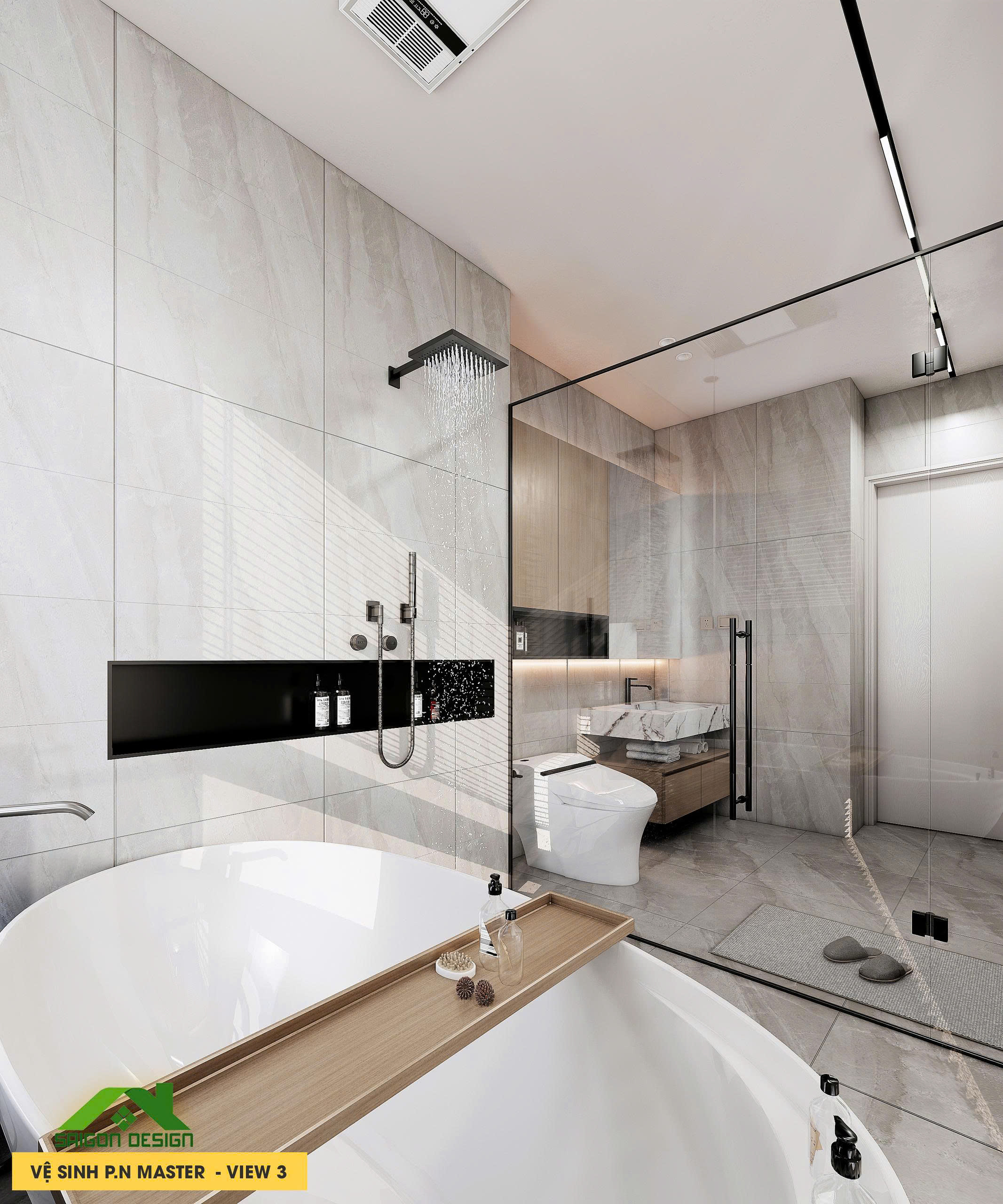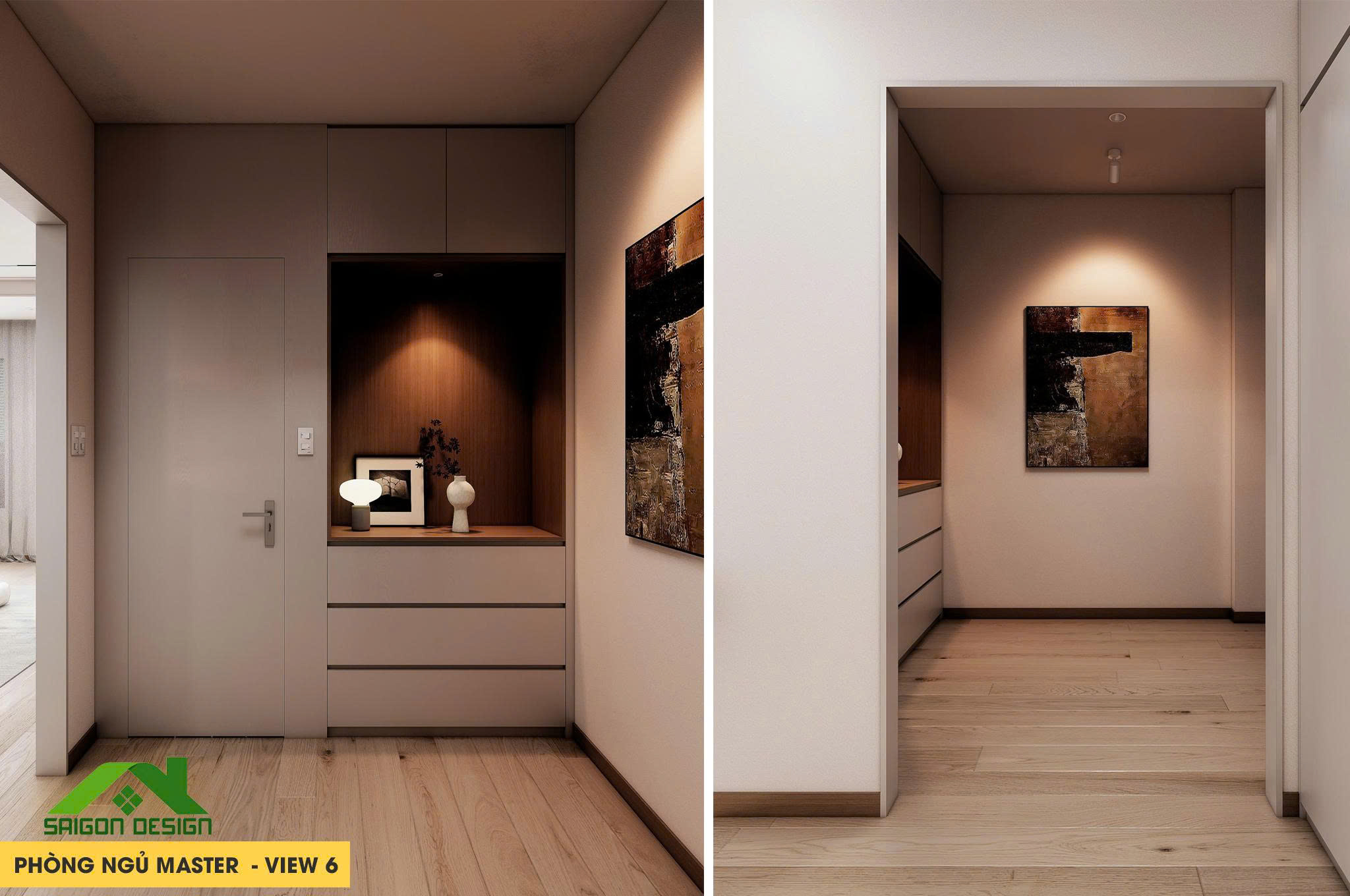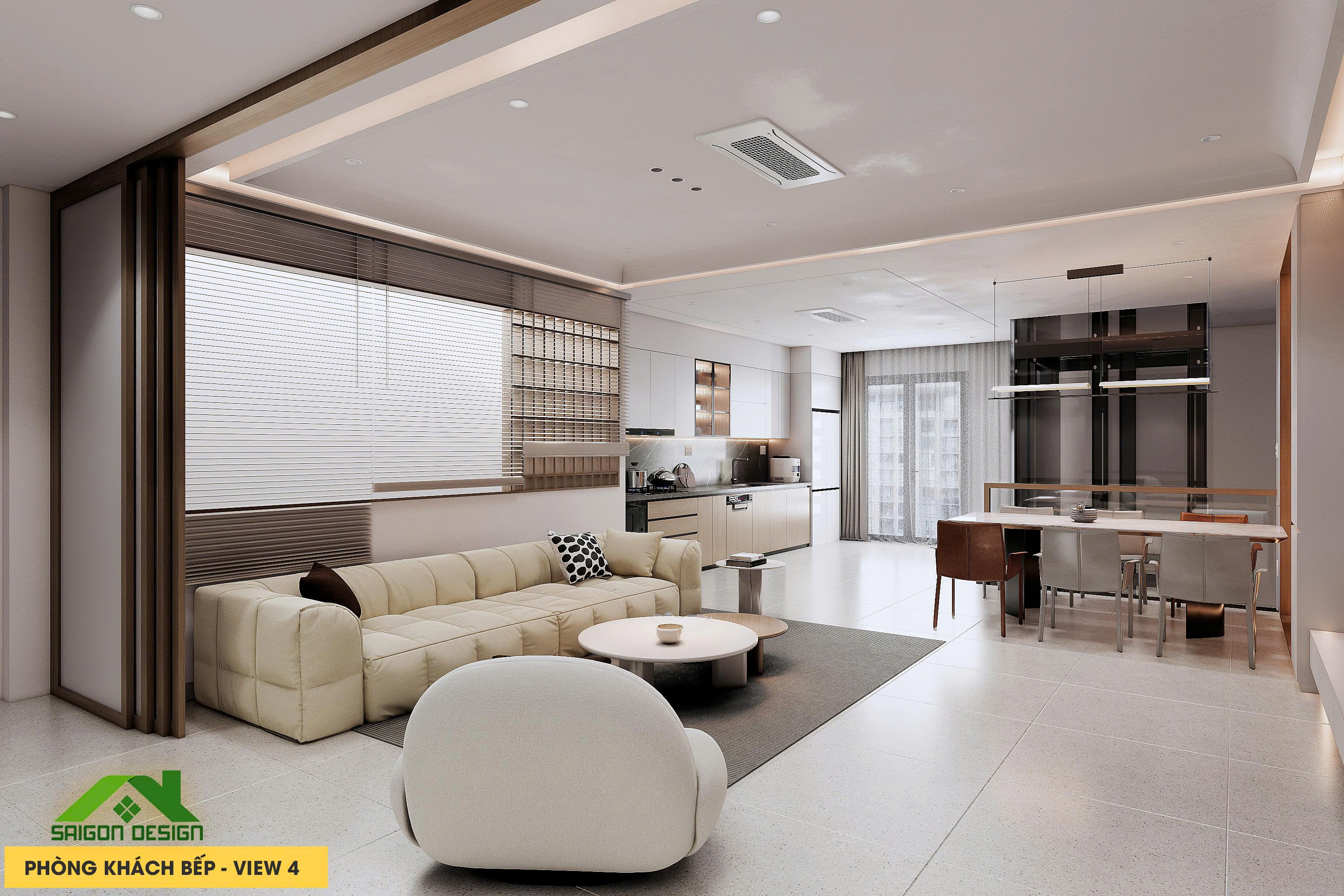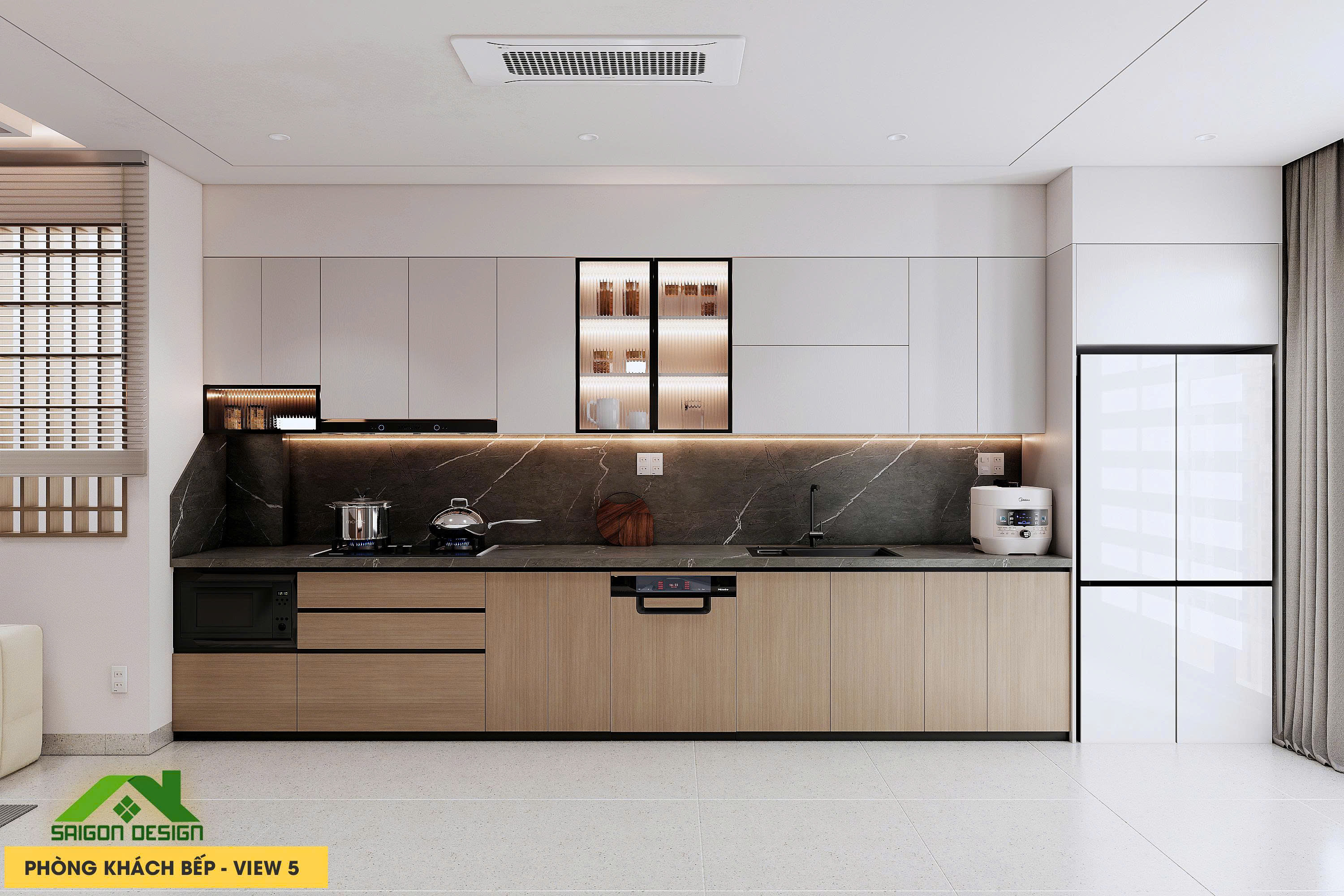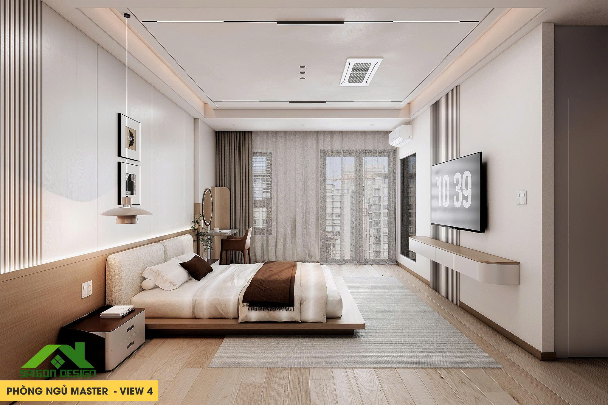 Dự án trung thành với phong cách Hiện đại, sử dụng bảng màu chủ đạo gồm Trắng và Gỗ. Sự kết hợp giữa sắc trắng tinh khôi và tông gỗ ấm áp tạo nên một tổng thể trang nhã, giúp không gian như rộng mở và nhẹ nhàng hơn.